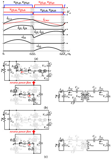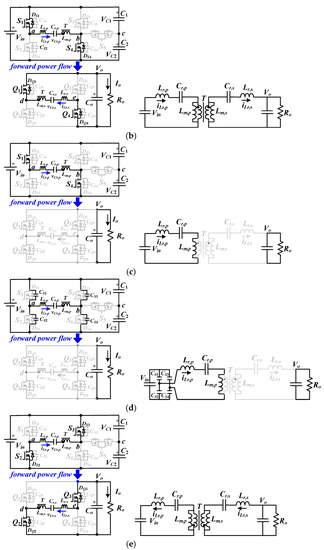 Figure 5d gives the circuit structure of the proposed converter operated as a reverse power flow condition from Vo (load side) to Vin (input side). Since the primary-side voltage Vin is controlled at 400 V (in high voltage range) under reverse power operation, S5 turns on and S3 and S4 are off. The full bridge resonant circuit with active switches Q1~Q4 are used and controlled on the right-hand side of the proposed circuit. The voltage doubler rectifier with synchronous switches S1 and S2 are used on the left-hand side. Figure 7 illustrates the PWM signals and mode circuits of the presented circuit under reverse power operation.