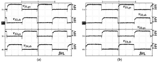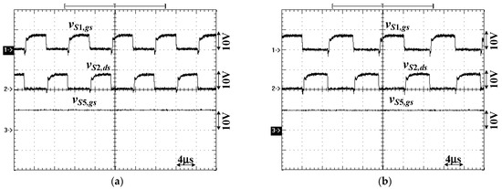 Figure 11, Figure 12, Figure 13 and Figure 14 provide the measured waveforms of the proposed circuit under the forward power operation and Figure 15 gives the test results under the reverse power operation. The proposed converter is operated at a full bridge (or half bridge) resonant circuit when Vin = 100–200 V (or 200–400 V). To avoid the circuit variation between the full bridge and half bridge circuits at Vin = 200 V, a ±2 V voltage tolerance is used to determine the low and high input voltage ranges. That means the full bridge (or half bridge) resonant circuit is used on the left-hand side of the proposed circuit under Vin = 100–202 V (or 198–400 V). Figure 11 and Figure 12 shows the test waveforms of the proposed converter under full bridge resonant circuit operation at Vin = 100 and 202 V, respectively. Figure 11a,b provide the measured PWM signals of S1–S4 under 20% and 100% loads at a Vin = 100 V input. Since the full bridge resonant circuit is used, S5 is off. One can observe S1–S4 have lower switching frequencies at a 100% load than a 20% load. Figure 11c,d provide the test results on the primary side and secondary side of the presented converter at the full load condition. From Figure 10, the proposed converter has a 1.92 voltage gain at Vin = 100 V and the switching frequency index F ≈ 0.47. That means the switching frequency fsw is less than the series resonant frequency fr. Therefore, power switches S1–S4 are operated at zero voltage switching and the synchronous switches Q1–Q4 are turned off zero current switching. The square waveform is generated on leg voltage vab. When vab is a positive (or negative) voltage in Figure 11c, iLr,p and vCr,p increase (or decrease). In Figure 11d, the voltage vCr,s becomes constant when iLr,s = 0. Similarly, the test results of the proposed converter operated at Vin = 202 V are provided in Figure 12. From Figure 10, one can observe that the proposed converter has a 0.96 voltage gain, and the switching frequency index is equal to 1.03. That means the switching frequency is greater than the series resonant frequency. Therefore, the waveforms iLr,p, vCr,p, iLr,s and vCr,s are quasi-sinusoidal signals in Figure 12c,d. Figure 13 and Figure 14 show that the measured waveforms of the proposed converter operated at a half bridge resonant circuit and forward power flow operation under Vin = 198 and 400 V, respectively. Under a half bridge resonant circuit operation, switch S5 is on and S3 and S4 are off. Power switches S1 and S2 are controlled by variable frequency modulation. Figure 13a,b give the gating signals of S1, S2 and S5 under 20% and 100% loads at a Vin = 198 V input. Due to the fact that the voltage gain at Vin = 198 V is greater than unity, the switching frequency fsw > resonant frequency fr and the synchronous switches can be turned off at zero current switching in Figure 13d. Similarly, the test results of the proposed circuit at Vin = 400 V input are provided in Figure 14. The switching frequency of the presented circuit at Vin = 400 V input has a lower voltage gain than the 198 V input case and the switching frequency is greater than the series resonant frequency. The quasi-sinusoidal waveforms are measured on iLr,p, vCr,p, iLr,s and vCr,s. Figure 15 gives the test results of the presented converter, operating at reverse power operation at Vin = 400 V, Vo = 48 V and a 100% load condition. The half bridge circuit is operated on the high voltage side. Q1–Q4 on the low voltage side are controlled as main power switches with variable frequency modulation and S1 and S2 on high voltage side are operated as the synchronous switches. Figure 15a,b show the PWM signals of Q1–Q4 at 20% and 100% loads. Figure 15c shows the waveforms vde, iLr,s and vCr,s on the low voltage side under a full load condition. Figure 15d shows waveforms iLr,p, vCr,p and Io,in on the high voltage side. Figure 16a–d give the PWM signals of S1 for Vin = 100, 198, 202 and 400 V, respectively, under forward power operation. Similarly, Figure 16e provides the measured signals of S1 under reverse power operation. From the measured results in Figure 16, one can observe that the power switch S1 is turned on at zero voltage switching under the forward power operation and Q1 is turned on at zero voltage switching under the reverse power operation. Figure 17 shows the PWM signals of S3–S5 under Vin = 100–400 V. When Vin is increased from 100 to 202 V, the proposed converter is operated at a full bridge circuit structure. Therefore, S5 is off and S3 and S4 are controlled with a variable frequency modulation. If Vin is increased from 202 to 400 V, the proposed converter is operated at a half bridge circuit structure. Thus, S5 is on and S3 and S4 are off. The measured circuit efficiencies of the proposed converter are 92.7, 91.5 and 93.1% at 100, 198 and 400 V input and the full load condition.