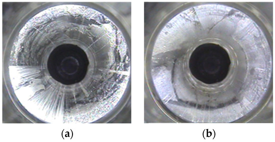 From Figure 6, it can be seen that the rock mass located 0–0.6 m above the roof of the roadway is relatively fragmented, and longitudinal cracks are developed. The rock mass located at 0.6–2.8 m contains many types of cracks, such as longitudinal cracks, transverse cracks, and cross cracks, and they are relatively developed. The area at 2.8 m mostly consists of annular cracks, but local fragmentation also occurs. Annular cracks and longitudinal cracks develop at 3.4–4 m on the roof of the roadway, and microcracks develop from 4–5.6 m.