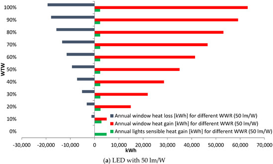 Figure 7 shows that an increase in the WWR percentage causes the cooling load to raise. In the 0% scenario, the annual consumption of energy increased, although this decreased in the 10–20% WWR scenarios. However, after this point, there are minimal differences in all the LED lighting scenarios between 20% and 100%.