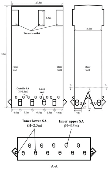 The secondary air system of the first 600 MW supercritical CFB boiler in the world was involved in the present study. As shown in Figure 1 [18], this boiler consists of a pant-leg furnace, six steam-cooled cyclones and six external fluidized bed heat exchangers (FBHEs). The secondary air coming from the rear wall direction is divided into two paths, one path is used for the outside SA and the other path is used for the inner SA [19]. Figure 2 shows the body structure and the locations of the secondary air ports of the boiler, while the section views A-A and B-B show the symmetrically arranged secondary air system. Figure 2 also gives the dimensions of the furnace. All the outside SA (A1–A8, A1′–A8′) and inner upper SA (B1–B5, B1′–B5′) were about 5.5 m from the air distributors while 2.5 m for the inner down SA (BⅠ–BVIII, BⅠ′–BVIII′). In order to obtain uniform airflow, all the windboxes adopted an isobaric design.