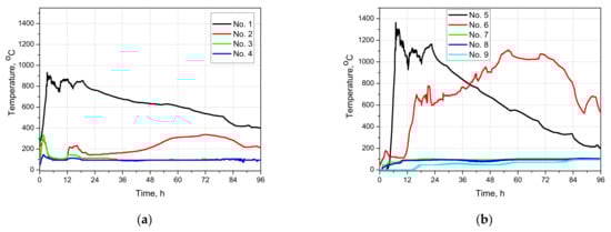 The gasification channel was prepared along the bottom part of the seams and its dimensions were 0.1 × 0.1 m. Sand was used to fill the voids between coal blocks and the reactor’s walls as well as for the creation of the roof stratum. Fourteen temperature sensors were installed inside the gasification chamber to measure distributions of temperature during the UCG tests (Figure 5). The Nos. 1–4 were installed in the gasification channel, Nos. 5–14—inside the coal artificial seam.