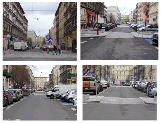 Figure 1 shows testing ground Nos. 1, 2 and 3, reconstructed in 2019 (marked yellow) and the two-way street reconstructed in 2016 (marked blue), i.e., streets with an implemented Tempo-30 zone. The arrows show the direction of traffic. Additionally, shown are the streets where reconstruction is currently taking place (marked green) or has been scheduled (marked red). Before reconstruction, the volume of traffic during peak hours was ca. 200–250 veh/h in both directions. Each of the above-mentioned streets had a 14 m-wide carriageway before reconstruction and carried traffic in both directions. Angled parking was allowed on the carriageway and footway on all these streets. The analysed urban block is bounded by main traffic arterials of Szczecin used by 2500–5500 veh/h during peak hours, including one dual carriageway with a tramway track running in the wide median between the two carriageways and three single-carriageway streets with four traffic lanes.