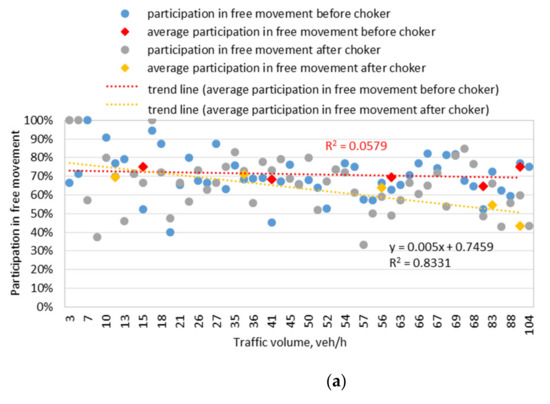 Since with the determination factor of 6%, the share in free movement in testing ground No. 1 before the choker does not depend on the traffic volume, the equation was not included in Figure 7a, in line with the principles of statistical analysis. The obtained equations are valid for a specific street only, and thus they should not be used in other analyses. The share in free movement also depends on the importance of the street under analysis, length of the test section between the intersections, number of main street businesses before and after the choker, architecture (multi-storey buildings located away from the footway, row or detached houses, detached public buildings such as schools or kindergartens), demand for parking before and after the choker, downtown or uptown location, etc.