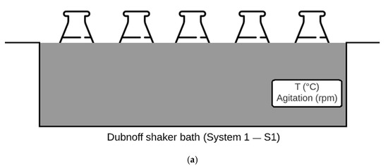 Finite bath tests were performed in duplicate. The two systems used were Dubnoff shaker bath—system 1 (S1), and a mixing reactor immersed in a thermostated bath, model SL-154/10, from the Solab brand—system 2 (S2). In Figure 1, it is possible to observe the schematic representation used to develop the experiments.