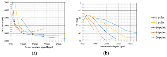 Iron loss parameters presented in Table 4 are for NO20 laminations and these parameters are kept constant even if the number of poles and the electric frequency vary. Iron losses are computed element by element by the FEA software using the Bertotti method with Equation (22).