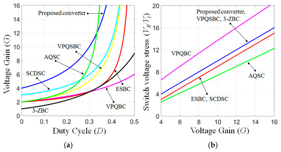 The expressions of the voltage gain comparison of the proposed SCQSBC and those of the other high gain converters are shown in Table 2 and also mentioned in Figure 5a. It can be found that the gain of proposed SCQSBC is the highest in compared with other converters through the whole duty cycle lower than 0.33.