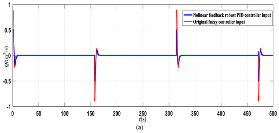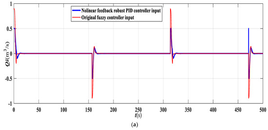 The input signal is corelated with amplitude in the form of a square wave varying from 0.5 m to 1.5 m. Although (2) is considered to construct the PID controller, a nonlinear mathematic modeling which is more complicated is employed for simulations. On the condition that the maximum inflow rate of the tank is maintained at 0.5 m3/s, the results of nonlinear feedback robust PID control can be used to determine that the mean control input is 0.0153 m3/s. The simulation results are presented in blue curve of Figure 3a,b, where Figure 3a displays the curve of the control input and Figure 3b displays the curve of the water level. No overshooting occurs, and quick tracking is achieved. Because a complex nonlinear model is used in the simulation whereas a simplified linear model is used to design the controller, system robustness is ensured.