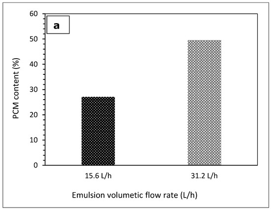 (a) PCM content of the microcapsules and (b) process quality parameters at different volumetric flow rates.
