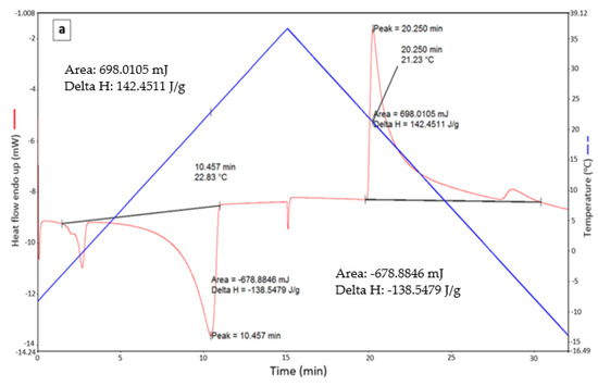 where is the latent heat of microcapsules (J/g) and is the latent heat of bulk PCM (J/g). In Equation (1), it is assumed that the influence of the shell polymeric layer on the latent heat of the incorporated PCM is negligible.