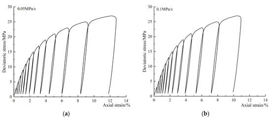 Figure 7 presents the curves that were measured under the cyclic loading and unloading processes. Overall, the change in behaviour was the same; as the stress gradually increased, the axial stress–strain curve experienced two stages which were described as “dense–sparse”. With the increase in deviatoric stress, the strain that was generated increased in each cycle and the growth rate accelerated gradually. With the increase in the loading rate, the total axial strains at the end of the cycle were 11.67%, 9.87%, 8.47%, 7.62%, and 6.25%.