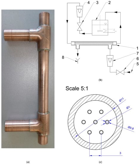 This paper presents the results of experimental tests performed using a shell and tube mini heat exchanger (STMHE). A schematic drawing of the analysed heat exchanger is shown in Figure 1. It consisted of seven brass tubes with outer diameter of , inner diameter of , and length of . The tubes were arranged in a hexagonal arrangement, and the tube pitch was equal to . The thermal conductivity coefficient of brass was assumed to be [20]. The tube sheet was made of thick copper sheet. The exchanger shell was made of copper and had an internal diameter equal to . All elements of the STMHE were connected by means of brazing. The heat exchanger was insulated along its entire length with an insulation layer made of polyurethane foam.