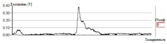 This method allows for the detection of all imperfections and defects of the stator core, regardless of their position. The measuring and position transducers are placed on a trolley that moves along each stator notch, thus scanning the entire core. On the screen through LabVIEW, the transducer position inside the stator is observed, and the state of sheets is recorded. Figure 4 shows the spectra recorded in three notches for the flow variation by 10%. The existence of defects in stator iron may be observed.