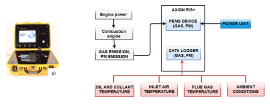 The Micro PEMS Axion R/S+ mobile analyzer system manufactured by Global MRV was used for all exhaust emission measurements on the static test bench. It enables measurement of the concentration of gaseous toxic exhaust compounds with the use of a non-dispersive infrared—NDIR (CO2, CO, HC) analyzer and an electrochemical (NO) analyzer. The equipment also allows the measurement of PM concentration using the Laser Scatter-based method, in which the speed of particle movement is measured (taking into account the values assigned to PM10). This apparatus was also used for real drive road tests in order to enable a measurement of exhaust sampled directly from the exhaust pipe. The Semtech DS measuring apparatus from Sensors Inc. was also used to measure the concentrations in real driving conditions, enabling the measurement of the concentration of gaseous exhaust components. The FID (Flame Ionization Detector) analyzer was used to measure the HC concentration. Measurement of NOx (NO and NO2) was performed with a non-dispersive analyzer with ultraviolet NDUV radiation. The concentration of CO and CO2 was determined by the non-dispersive method using NDIR (Non-Dispersive Infra-Red) radiation. The tests were supplemented with the measurement of particulate matter. For this purpose, the AVL Micro Soot Sensor (MSS) device was used to determine the PM concentration with the photoacoustic method. The measuring apparatus, shown in Figure 6 in and described in Table 3 gearbox RWD (Rear Wheel Drive), was equipped with a TWC (Three Way Catalyst) catalytic converter and was homologated in accordance with the Euro 3 standard numbered lists and can be added as follows.
