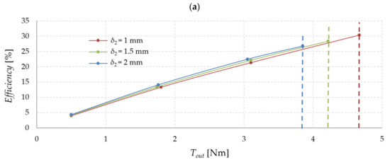 Next, the dependence of MPG efficiency on air-gap lengths was examined. The obtained gear efficiency vs. load torque characteristics determined for an input speed equal to 50 rpm and different values of air-gap lengths are shown in Figure 14. Dotted vertical lines in Figure 14 indicate the maximum load torque that the gear is able to transmit. It can be noticed that the air-gap lengths have a marginal impact on the slope of the efficiency characteristic; however, due to a change in Tout max, the maximum value of efficiency undergoes significant changes.