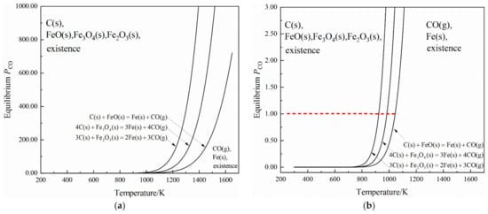 In actual BFs, the value of relative gas partial pressure of CO and CO2 was larger than 0.2. According to Figure 4, the lowest temperature was required to be more than 857 K for the reaction between C(s) and Fe2O3(s) with only CO generated and more than 808 K for the reaction between C(s) and Fe2O3(s) with only CO2 generated, respectively. This was so that the possible reactions of carbon and iron oxides in the BF could be set as more than 808 K.