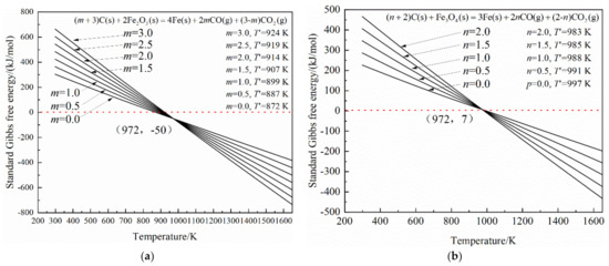 The coupling reactions equations of the C-CO2 gasification reaction and C-FexOy direct reduction reaction were shown in Equations (34), (37) and (40), and m, n, and p were coupling parameters for Fe2O3 (s), Fe3O4 (s), FeO (s), respectively. Due to the existence of CO2, the variation range of m, n and p were fixed as 0 ≤ m ≤ 3, 0 ≤ n ≤ 2, 0 ≤ p ≤ 1, respectively. Equations (35), (38), and (41) were the isothermal equations between the Gibbs free energy and gas partial pressure. According to the ratio of the gas partial pressure of CO and CO2, the Equations (36), (39), and (42) were used to calculate the equilibrium gas partial pressure and the equilibrium gas volume fraction.