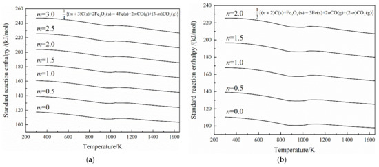 From Figure 5 and Table 4, for the same kind of iron oxide, the energy consumption of the reduction reaction with only CO generated was nearly twice as much as that of the reduction reaction with generating CO2. In the same type of reaction, energy consumption in order from high to low were Fe2O3 (s), Fe3O4 (s), FeO (s). It was important to note that the energy consumption of the above reactions reached a peak at 298K, and remained downward as a function of temperature. For instance, the reaction energy consumption per ton of iron through the reaction of 3C(s) + 2Fe2O3(s) = 4Fe(s) + 3CO2(g) was decreased from 2.100 GJ/t at 298 K to 1.848 GJ/t at 1650 K, and the decreased percent was 12.01%, which should not be neglected. So, the use of the reaction enthalpy at 298 K for the heat calculation was inappropriate, and the reaction temperature should be confirmed when the reaction enthalpy was used.