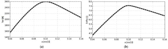 Example input data calculated with Cantera: (a) adiabatic flame temperature, (b) expansion ratio, (c) heat of combustion, and (d) unburned mixture density (solid lines) as a function of CH4 fraction in air. Cantera generated data with 1–6th order polynomial fit curve (dashed lines). Data generated for initial temperature 293 K and pressure 1.01325 bar.