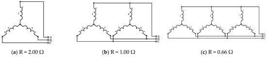 With 3 windings in each layer, the interconnection provides a choice of 15 possible schemes, among which the studied cases are provided Figure 6. Each studied scheme is accompanied by an evaluation of its DC winding resistivity. Higher resultant DC resistivity leads to a higher torque under lower speed conditions, of course, if sufficient input electrical power is available. However, under higher speed conditions, a lower level of DC resistivity is beneficial and ensures the maximum mechanical output power.