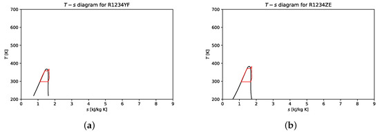 T–s diagrams for fluids of Groups 3 (R1234YF, R1234ZE and R134A) and 4 (R507A). (a) R1234YF; (b) R1234ZE (c) R134A; (d) R507A.