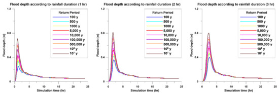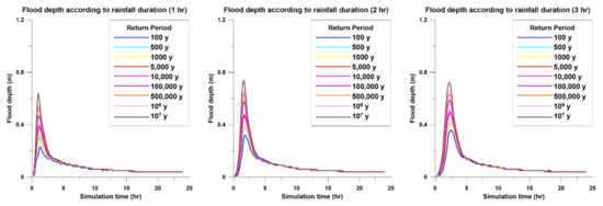 From the results of the 2D internal flood analysis, flood depths according to rainfall duration for each return period for NPPs 2, 3, and 4 were found, as respectively shown in Figure 13, Figure 14 and Figure 15. The maximum flood depths according to a 2D analysis are shown in Table 6, Table 7 and Table 8. It can be seen in the results that the trend of the overall flood depth gradually increases and converges over time. The reason for this is that increasing flood heights spread to other areas as the flood generated by an external event flows into specific spaces through door gaps, and at the same time, water flowing in from the outside decreases over time.