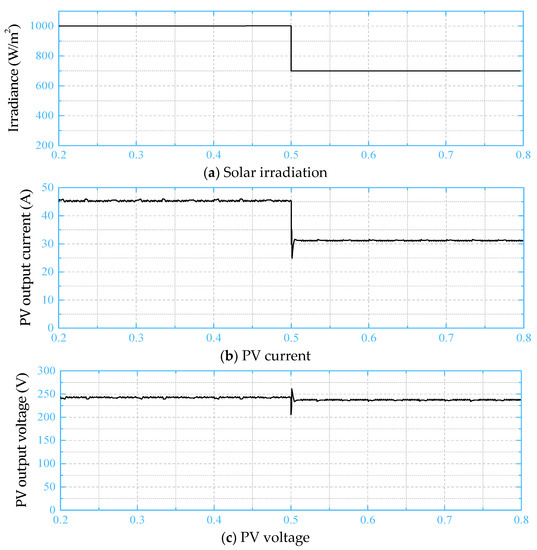 Figure 7 shows the PV panel output current, voltage, and power with a step-variation in irradiance profile from 1000 W/m2 to 700 W/m2 to ensure MPPT controller stability at different irradiance conditions. The constant voltage profile in Figure 7c proves that the PV array operates efficiently at the MPP, regardless the fluctuations in irradiance profile. In addition, the extracted power at 1000 W/m2 matches the listed maximum power at the standard test conditions presented in Table 4. On the grid side, Figure 8 exhibits the inverter output voltage. The inverter terminal-voltage is a high-frequency modulated at 7-levels before the grid-current filter with its fundamental component is in-phase with the grid-voltage, as depicted Figure 8. Figure 9 exhibits the change in the grid-voltage, grid-injected current, and grid-injected power with step variation of irradiation. The grid-injected current is sinusoidal waveform and in-phase with the grid-voltage for unity power-factor operation of grid-integrated PV-system. To prove the robustness of the grid-tied controller with minimum error, the reference and actual grid currents are depicted in Figure 10. The actual grid-current tracks the reference current with minimum error, low settling time, and enhanced system response.