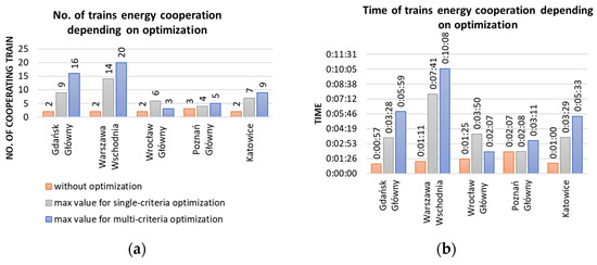 The presented results illustrate that at each of the stations for the analyzed trains, without any changes in the timetable, there were traffic situations that enabled energy cooperation among trains that lasted from 57 s at the Gdańsk Główny station to 2 min and 25 s at the Poznań Główny station. As a result of the optimization, it was possible to increase the number of participating trains, and the duration of energy cooperation increased seven-fold in the case of the Warszawa Wschodnia station. In each of the analyzed cases, it was found that at least equal or better values of the number of cooperating vehicles were obtained using the function described in (8) than in (9), while better results regarding the length of the cooperation time were obtained using (9) as the objective function, which is consistent with the assumption. It is worth noting that a larger number of cooperating trains does not necessarily mean a longer cooperation time.