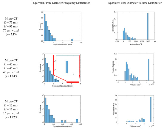 Figure 6 gives the distribution characteristics of pores, vugs, and fractures in cores of different scales. For the sample with a core diameter of 75 mm, the CT test resolution is 75 μm, which can identify the collocation relationship between vugs, fractures, and large pores. Most pores of this sample have equivalent pore diameters less than 2 mm, and a small number of pores with equivalent diameters between 2 mm and 20 mm. The maximum pore equivalent diameter is 15.55 mm. The volume of large vugs with the maximum equivalent diameter of 15.55 mm and 15.32 mm accounts for the largest proportion, although the number of vugs is small. For the sample with a core diameter of 45 mm, the CT test resolution is 45 μm. Most pores of this sample have an equivalent pore diameter of less than 1.2 mm, and a small number of pores with an equivalent diameter between 1.2 mm and 8 mm. The maximum equivalent diameter is 6.81mm, and the volume share is also the largest. For the sample with a core diameter of 13mm, the CT test resolution is 13 μm. Most pores have equivalent pore diameters less than 500 μm, and a small number of pores with equivalent diameters between 500 μm and 4000 μm. The maximum equivalent diameter is 3.72 mm. The volume share of pores with equivalent diameters of 3.68 mm and 3.72 mm is the largest, although the number of corresponding pores is small. For the sample with a core diameter of 2 mm, the CT test resolution is 1 μm. All pores have equivalent pore diameters less than 2 mm. There are only pores, no fractures, and cavities. Most of the equivalent diameters are less than 50 μm, and a small number of pores with equivalent diameters between 50~300 m. The maximum equivalent diameter is 256 μm. The largest proportion of pore volume has 202 μm and 256 μm equivalent diameters. For the sample with a core diameter of 0.9 mm, the resolution of the CT test is 0.5 μm. All pores have equivalent diameters less than 2 mm. There are only pores and no fracture and cavity. Most pores have an equivalent diameter of less than 20 μm, and a small number of pores with equivalent diameters between 20 μm~120 μm. The maximum equivalent diameter is 110 μm, and the volume share is also the largest. The number of small pores is the majority, much more than the number of large pores in terms of quantity. In terms of volume, the volume share of large-diameter pores is much larger than that of small pores. With the decrease in core size, the diameter and porosity of pores, vugs, and fractures are decreasing.