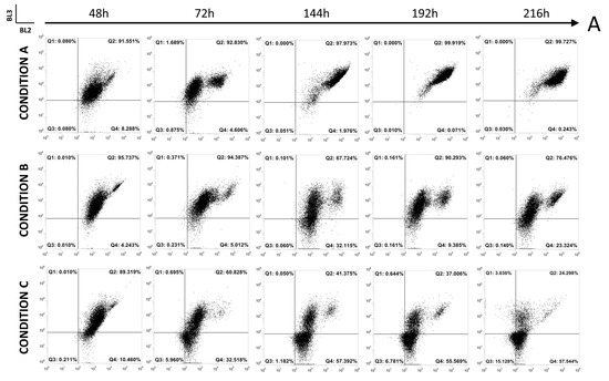In order to understand the intracellular adaptation of Y. lipolytica W29 cells at the tested conditions during growth and lipase production, the yeast cells were monitored during cultivation on either glucose or WCO in the three different tested conditions (A, B, and C) for their lipid content through flow cytometry. The intensity of fluorescence associated with Nile-red-stained cells is correlated with the degree of cell lipid assimilation and the lipid accumulation [25]. The fluorescence is detected both at 695 ± 40 nm (BL-3) and at 574 ± 26 nm (BL-2). Specifically, red fluorescence (BL-3) is associated with polar lipids, such as phospholipids, while the orange fluorescence (BL-2) is associated with neutral lipids, such as triacylglycerols (TAGs). In all the investigated conditions, the red fluorescence (BL-3) showed lower values compared to the orange fluorescence (BL-2) (Figure 3). Overall, the values of BL-3 for each condition did not significantly change over time, showing that the phospholipid amounts compared to TAGs were similar for cells grown on glucose and WCO. Therefore, the analysis of the orange fluorescence (BL-2) was used to identify the lipid assimilation and accumulation processes. Specifically, in the presence of glucose as a carbon source (Figure 3A), the BL-2 value exponentially increased for condition A, reaching at 144 h the highest value of the three tested conditions. For condition B, only a subpopulation of yeast cells after 72 h showed increased BL-2 values until 144 h. Condition C showed, overall, the lowest BL-2 value of the three conditions.