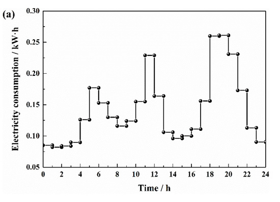 To determine the load profile over a specific period of time, Type 14 h is used. TRNSYS Type 14 h provides a time-dependent forcing function model in transient simulation. The pattern of the forcing function is established by a set of discrete data points indicating its values at various times through one cycle. The hourly electricity consumption of rural residences in China is used as the load data in this study [41], as shown in Figure 3. The referenced hourly electricity consumption is the statistical value of 30 rural residences’ test results, which reflects the characteristics of rural residential electricity consumption in different months in China. The annual electricity consumption is divided into three stages, namely the transition stage, the heating stage, and the air conditioning stage. May, June, September, and October are the transition stage. January, February, March, April, November, and December are the heating stage. July and August are the air conditioning stage. It can be seen from the figure that the hourly electricity consumption of rural residences presents the characteristics of three waves, and the occurrence time of the wave in the morning has variation at different stages which is in line with the reality of life. It needs to be explained here that China’s rural energy consumption structure is developing towards a clean type, but the heating mode in winter is mainly coal burning [42]. Therefore, the electricity consumption of heating in winter is not considered in this paper.