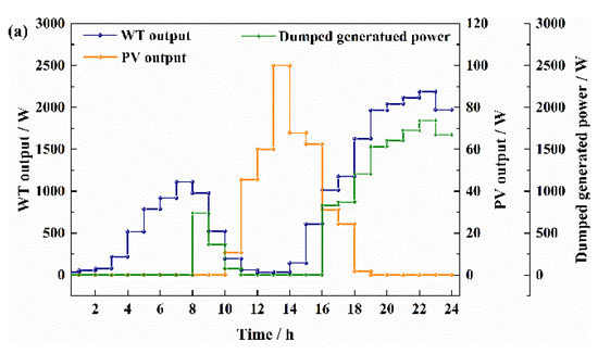 When the installed capacity ratio of the WT and PV is 5:1, the hourly characteristics for two typical days (15 January and 15 July) are shown in Figure 9. Combined with the radiation and wind velocity data on January 15 (Figure 7), it can be seen that the power output of the WT and PV are consistent with the changes of the wind velocity and radiation. On 15 January 15, the maximum wind velocity is 8.10 m·s−1 at 23:00, and the WT output is 2188.01 W at the same time. The maximum radiation is 795.60 kJ·h−1·m−2 at 14:00, and the PV output is 99.94 W at the same time. As shown in Figure 9b, the battery is in a state of neither charging nor discharging for two periods (9:00~11:00 and 17:00~24:00). This is because the FSOC value of the battery is greater than the upper limit of 1.00 during those periods, while the WT and PV output can meet the load consumption and there is excess power. The excess power will be dumped by the system, as shown in Figure 9a. On 15 July, the wind resource is poor, and the WT output is very little as the wind velocity is not up to the cut-in wind velocity. The load electricity consumption mainly comes from the battery and PV output. As shown in Figure 9d, before 11:00, the battery is in the discharge state, and the FSOC goes down from 0.97 to 0.95; between 12:00 and 16:00, the battery is in the charge state, and the FSOC goes up from 0.95 to 0.96; after 17:00, the battery is in the discharge state. It can be seen from Figure 9c that from 8:00 to 22:00, the PV output is greater than zero, while the PV output could only not meet the load electricity consumption from 12:00 to 16:00, and there is a surplus which will be stored in the battery.
