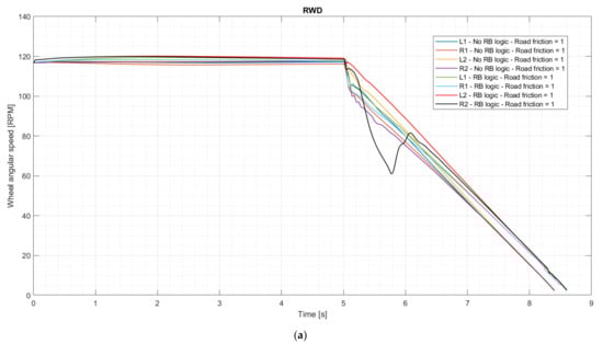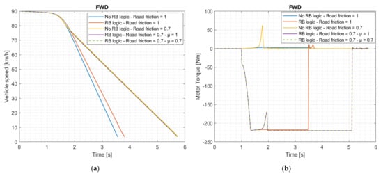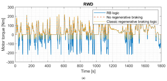 In [5], a braking torque distribution algorithm is presented: calculation of the optimal braking torque distribution is based on the ECE braking regulation [8], and the motor and battery limitations are taken into account together with various limitations, as with the RB logic, but the strategy is mainly based on the concept of optimal braking distribution. Conversely, the RB logic causes the system to deviate from the latter in order to maximize energy recovery whenever dynamic conditions allow it without compromising the stability of the vehicle.