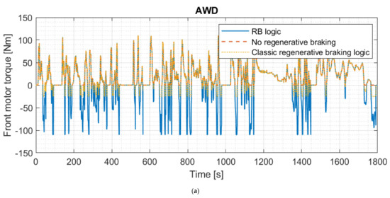 The front electric motor torque required () is calculated in Equation (17), taking into account the front wheel radius, the inertia of the wheels, the inertia of the differential, the inertia of the motor, and the transmission ratios.