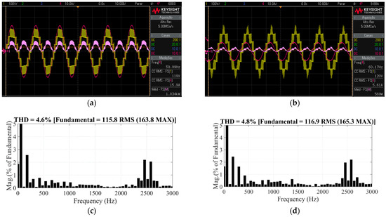 Figure 9a contains the waveforms for the CHB-ML output voltage (yellow), current (red) and power (magenta) injected into the electrical grid during irradiation of 1250 W/m2. Still for this situation, the inverter voltage and current harmonic spectra are shown in Figure 9c,e, respectively. Figure 9b contains the waveforms for the voltage (yellow), current (red) and power (magenta) during irradiation of 300 W/m2. The harmonic spectra for both the inverter voltage and output current are shown in Figure 9d,f, respectively. For all situations, THD was calculated considering harmonics up to 3 kHz. The electrical parameters for the situations of high and low irradiance are summarized in Table 3. It is interesting to observe the equilibrium reached by the indexes denoting the small differences in the power contribution of each PV array for both situations. Another point to be considered is the superiority of the indexes for high irradiation, confirming the more significant contribution of the PV arrays for this condition.