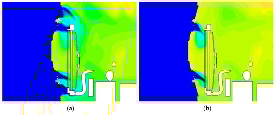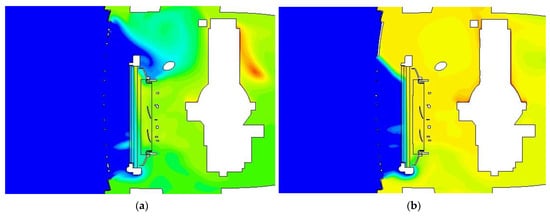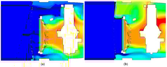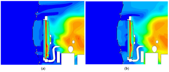 Figure 9 shows the comparisons of the radiator inlet mass flow under different schemes. As shown, the mass flow of scheme 1 and scheme 2 was slightly higher and lower than that of the original vehicle, respectively. Further, Figure 10a shows that the air flow from the outside of the upper grille into the engine compartment deviated from the heat exchanger and basically does not flow to the heat exchanger. In addition, from Figure 11, closing the outside of the upper grille increases the pressure in front of the inlet of inner side for the upper grille, and the pressure difference between the inlet and outlet of the air flow inside for the upper grille increases. Therefore, the mass flow of scheme 1 has increased. According to Figure 12b, most of the air flow introduced from the inside of the upper grille is guided by the upper washing air introduced by the lower grille to bypass the radiator, so the reduction inlet flow of the radiator is not obvious in scheme 2.
