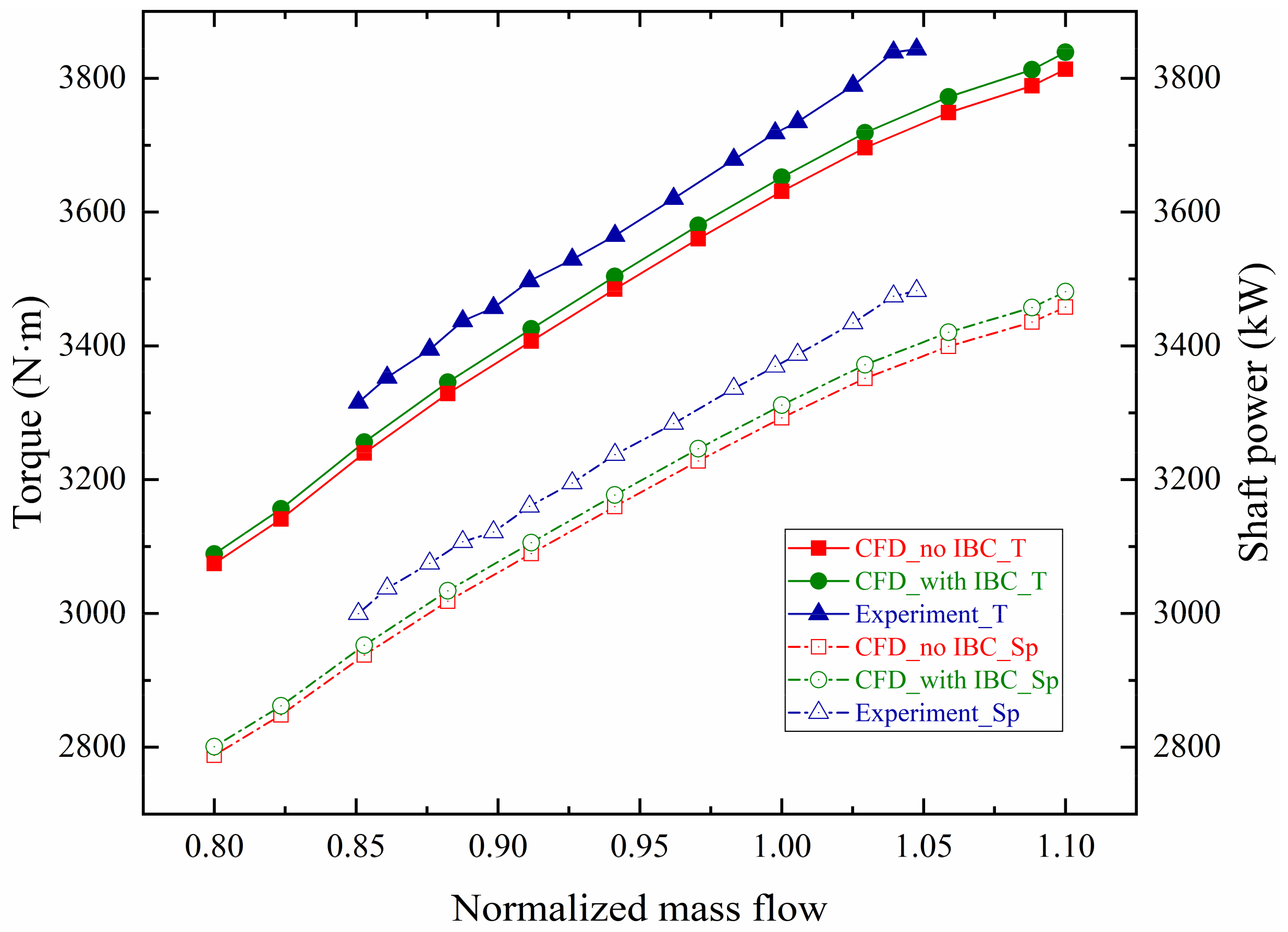 The characteristic curves of aerodynamic performance in Figure 4 show that PRt and ηis of the coupled calculations with IBC are closer to the experimental results than those without coupling. Furthermore, the predicted and measured characteristic curves of power consumption under design rotating speed are presented in Figure 5. Both torque and shaft power decrease with the decrease of the flow. The design point torque and shaft power are about 3723 N·m and 3374 kW, which are 2.5% and 2.4% away from the design point numerical values without IBC of 3631 N·m and 3292 kW, respectively, which are 1.9% and 1.8% away from the design point numerical values with IBC of 3652 N·m and 3312 kW. The reasons for the deviations between CFD and Exp. in Figure 4 and Figure 5 include several aspects. First, due to the difference of the single flow passage model in the numerical simulation and the accuracy of the algorithm itself without considering the surface roughness of blades and flow channels. Second, due to the deviation of the assumption of steady-state flow with no-slip adiabatic boundary in CFD and the actual three-dimensional viscous transient flow with slip nonadiabatic wall in experiment. Third, due to the influences of volute asymmetry on AVDs’ outlet airflow and compressor outlet spiral airflow parameters exacerbate errors from the sensor accuracy of measuring equipment.