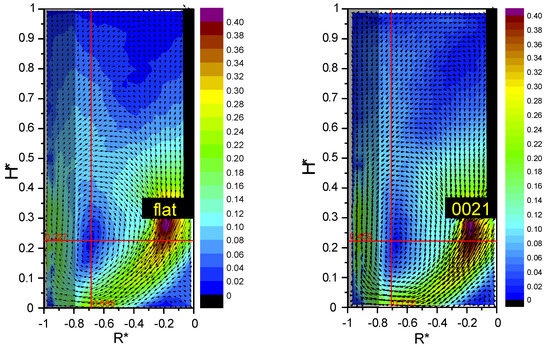 The measurements of axial and radial velocity distributions in a mixing tank with four standard baffles for the PBT45-6 impeller with a flat blade cross-section and for profiled cross-section blades were carried out using the PIV method. The obtained results are presented in Figure 9 in the form of dimensionless contour and vector maps U* = U/Utip = U/(π·D·N) = f(H*, R*) for the rotational frequency N = 240 min−1 (Re = 40,000). The presented graphs show the position of the circulation core, i.e., the point where radial and axial velocities marked as two intersecting red lines are equal to zero.