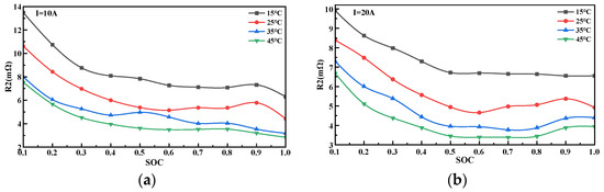 At the same discharge rate, the Ohmic resistance and polarization resistance increase with decreasing temperature and SOC; they decrease with increasing discharge rate when the temperature is constant. The experimental results correspond with the Butler–Volmer equation (BV) (the resistance decreases with increasing discharge current due to the influence of charge transfer within the cell. When the current is tiny, the ability of lithium-ions to cross the interfacial barrier is weak, and the polarization resistance rises sharply). In addition, all test data regression values for impedance parameter identification are higher than 0.9995.