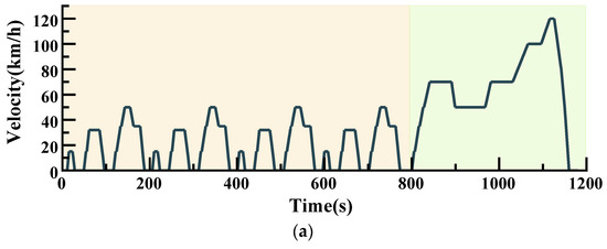 A common validation for the battery model is to conduct the charge–discharge test under constant current, while in real-world driving cycles the current is real-time. Therefore, the standard driving cycle, NEDC, is used to verify the accuracy of the battery model. The accuracy of the simulation results and experimental data is evaluated by the root mean square error (RMSE) and mean absolute error (MAE).
