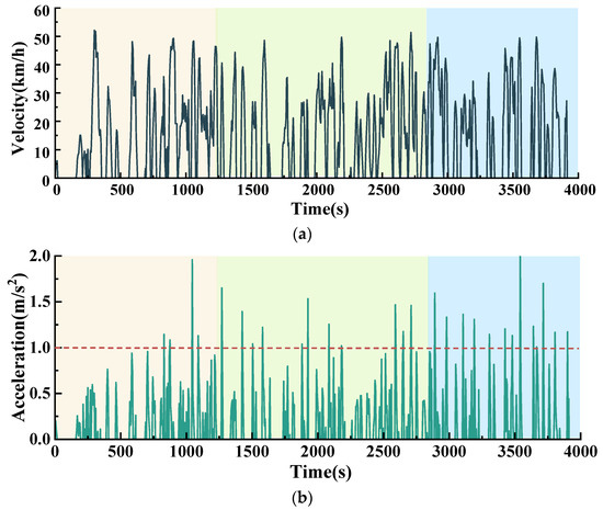 Based on the information of acceleration, the driving styles are classified as Aggressive and Gentle. Rapid acceleration and deceleration indicate aggressive driving behavior; smooth acceleration and deceleration represent gentle behavior in driving cycle. Analysis of the data reveal that aggressive driving behavior occurs when buses are entering and exiting stations, overtaking and changing lanes. While gentle driving with smooth acceleration, the buses often run at a constant speed or at low speeds close to idle on crowded roads. Classification of vehicle driving styles is usually based on driver and occupant comfort, and an acceleration of 2 m/s2 is used as a boundary to determine whether a driver is driving aggressively. However, for buses with high center of gravity and high carriage, a very small acceleration in their driving can cause large roll angle. Therefore, it is scientific to classify bus driving styles with acceleration values smaller than those of the car. Classification of bus driving styles by acceleration values is shown in Table 3.