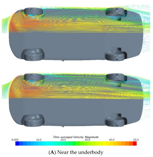 Figure 14A,B show the streamlines near the underbody and on the center plane, respectively. It can be seen from the streamlines that the width of both the front and rear wheel wakes is expanded when the ground is moving. This means that the elimination of the ground boundary layer leads to the enhancement of both the front and rear wheel wake, which may come from the accelerated flow near the wheel separation region. Furthermore, due to the expansion of the width of the front wheel wake, the middle area of the underbody is more strongly affected by the wheels, resulting not only in a decrease in air flow velocity in this area, but also a decrease in surface pressure.