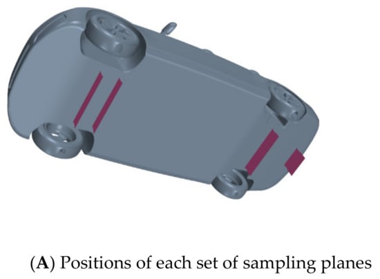 According to Section 3.2 and Section 3.3, it can be found that the low-drag state is decided by both the ground and wheel states; therefore, their comprehensive effects need to be investigated. Furthermore, even though the specific cause is not clear, it can be supposed that the low-drag state is linked to the flow rate near the underbody. In order to evaluate the lower underbody air flow rate, this study selected a set of sampling planes perpendicular to the x-axis at the following four important positions near the underbody: the axle of the front wheels (Plane A), the rear side of the front wheels (Plane B), the axle of the rear wheels (Plane C) and the rear end of the underbody (Plane D). The centerline of each sampling plane in y-direction coincides with the centerline of the vehicle body. The widths of the first three sets of planes are set to 0.3 m, and the sampling width of the last set of planes is set to 0.15 m. In addition, since the flow rate near the ground may be affected by the ground boundary layers, each set of sampling planes includes two planes with different heights. Plane one extends from the underbody to the ground, covering the complete ground clearance. Plane two only extends from the underbody to about half of the ground clearance, which is closer to the lower body. The specific location and size of each sampling plane are shown in Figure 27. In total, eight different sampling planes are generated, which are sequentially numbered as A1, A2, B1, B2, C1, C2, D1 and D2.