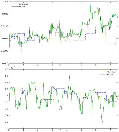 The application of the Goertzel algorithm decreases the computational complexity because sample Equation (10) are only calculated, while Equation (11) is determined at the end of full window acquisition. In Equation (10), the term: 2 cos(2πk/N) has a fixed value, unlike the recursive DFT algorithm where the trigonometric functions converting wN−kn to real and imaginary values in Equation (9) require the information about the sample number. It is possible to overcome this problem in the recursive DFT algorithm via the tabularization of trigonometric values from 1 to N, however, it requires the allocation of additional memory resources in the microprocessor.