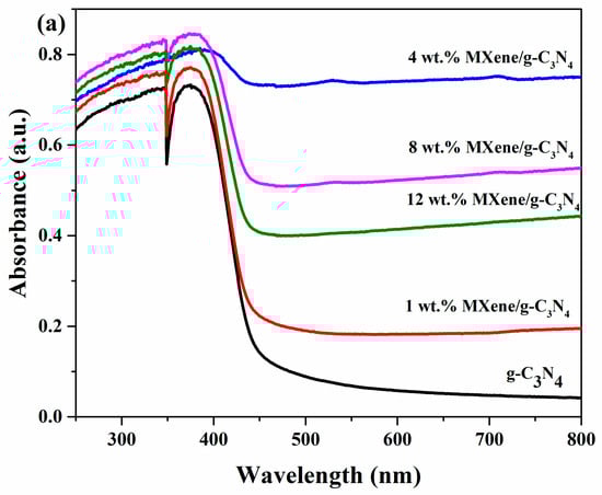 On the other hand, two different diffraction peaks, located at 12.5° and 27.7° of 2θ, were attributed to g-C3N4 footprints (JCPDS card No. 87–1526). The peaks at 27.7° indicate the multilayer π-π stacking of g-C3N4, while the peak of 12.5° signifies the in-plane repeated units [22,23]. The XRD patterns of MXene/g-C3N4 composites with different amounts of MXene loaded onto the heterostructure sample show almost identical diffraction peaks. Nevertheless, as the amount of MXene loading was increased to 12 wt.%, the peaks located at 12.5°, 13.9°, and 35° of 2θ became weakened. Such occurrences may happen due to the interaction between MXene and g-C3N4, which disrupts the aromatic conditions of g-C3N4 [13,24]. As such, the obtained XRD patterns of the as-synthesized heterostructure photocatalyst proved the successful loading of MXene onto g-C3N4. Furthermore, higher loading of MXene leads to the shift of peak towards a higher angle, indicating stronger interaction of the two different materials, which leads to a further stacking distance of g-C3N4.