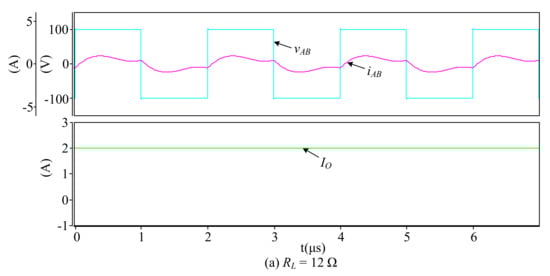 According to Figure 16, the output current keeps at 2 A when RL is equal to 12 Ω or 25 Ω, which means the CC output is successfully achieved. The input voltage vAB is in phase with the input current iAB, which means the input ZPA is achieved and most reactive power is eliminated.