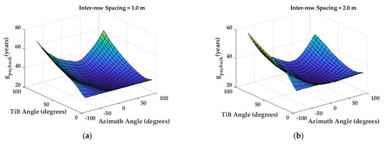 The optimization equation is based on multiple control variables, including the tilt angle () and azimuth angle () of panels and the distance between the arrays (). We assumed that the panels’ tilt angle could be vertically adjusted from parallel to the roofs () to nearly perpendicular to roofs () and the azimuth angle could be horizontally adjusted from () east to () west. A two-year tolerance was considered an acceptable return on investment to keep the system’s solar electricity generation at a nearly maximum level.