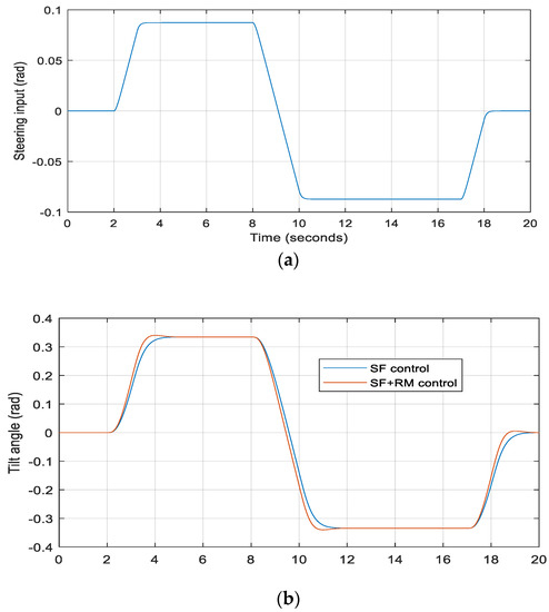 There are mainly direct tilt control (DTC), steering tilt control (STC), and combined DTC–STC methods, as studied in [1,2,3,4,5,6,7,8,9,10,11,12,13,14,15]. They can be designed by using a hydraulic or a servo motor actuator.