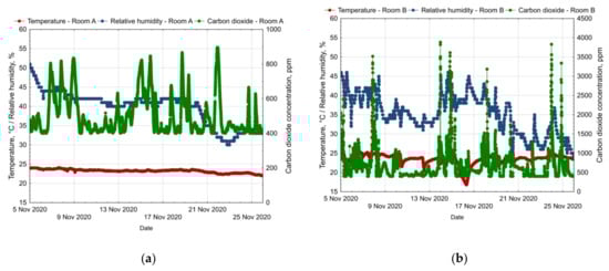 As the above graphs show, significant fluctuations in the concentration of carbon dioxide, temperature, and relative humidity in each room are visible. There was no visible impact of the day of the week on the variability of these values. As the weekly analysis did not reveal any clear trends of variability, it was decided to check the dynamics of the changes during the day. For this purpose, one representative day was selected. The dynamics of changes on this day for each of the rooms were presented. Figure 5 shows the daily distribution of values on the example of 16 November.