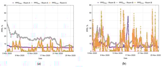 In the next stage, the predicted percentage dissatisfied (PPD) indices as a function of various parameters were analyzed. Lower values of the PPD index mean better indoor conditions. Even a preliminary analysis shows significant differences between the used coefficients. The most comfortable conditions were observed in rooms A and E, where PPD indices did not exceed 40 and 30%, respectively. In both cases, when comparing the PPDAcc and PPDPMV indications, it can be seen that the results obtained with the use of air acceptability and enthalpy take much higher values, often even twice as high. In both cases, however, it can be assumed that the conditions provided to the users were optimal. The situation is different in the case of other rooms. In rooms B and C, due to the high concentration of carbon dioxide, the temporary PPD indices increase temporarily above the value of 50 or 60%. On 16 November, a sudden drop in temperature to a value below 17 °C was visible in room B. It directly affected the increase in the PPDPMV coefficient to the value of over 40%. Such a situation may be a result of the window opening. As in the previous examples, the enthalpy-related coefficient also takes higher values. In the case of room D, this relationship is reversed, and the PPDPMV coefficient takes higher values than PPDAcc. This is a direct consequence of the temperature decrease below the value of 17 °C. A significant increase in the PPDPMV index can be seen in the third week when the temperature reaches its lowest values, and the results of the calculations are 30–60%.